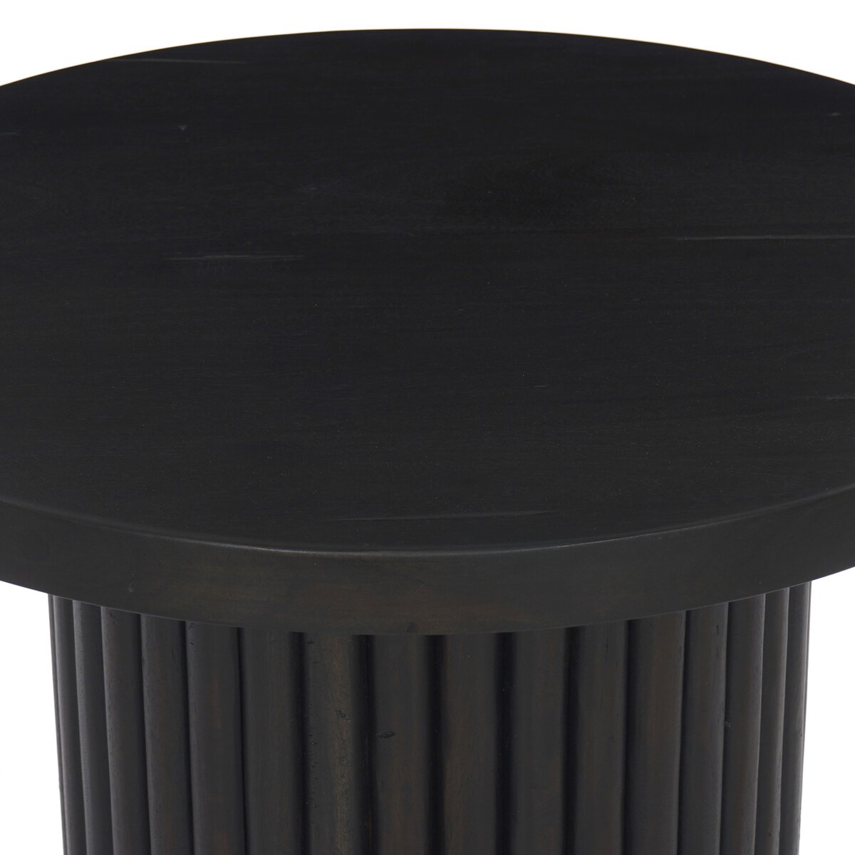 Inspired by decor in the majestic palaces of Jaipur, a conversation-starting end table is made from mixed reclaimed woods, with a rounded top and base with vertical reeding.