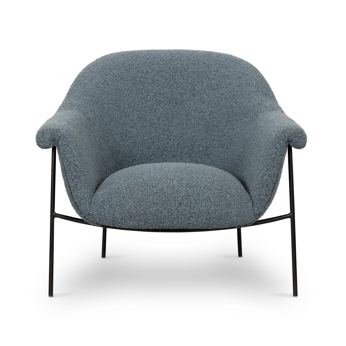 With a curvy silhouette and classic rolled arms, sky-blue boucle lends a fresh feel to vintage-inspired accent seating, with an airy iron cradle base for a beautiful balance of scale.