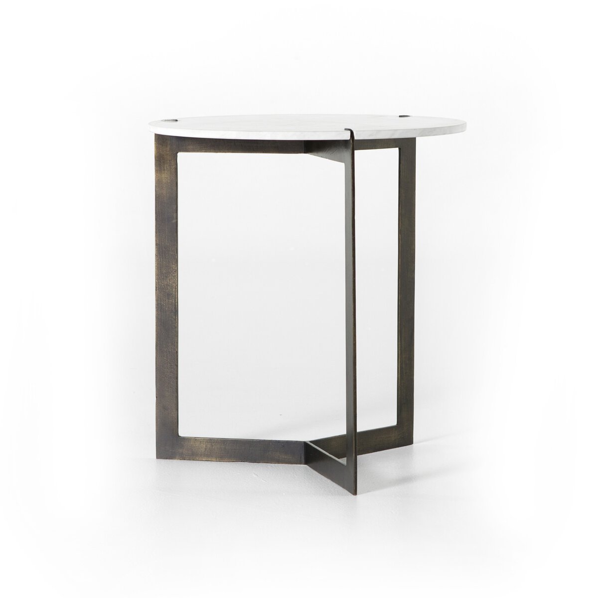 Opposites do tend to attract. A leggy base in hammered brass iron plays up a refined, precisely-shaped polished white marble top. Perfect in pairs.