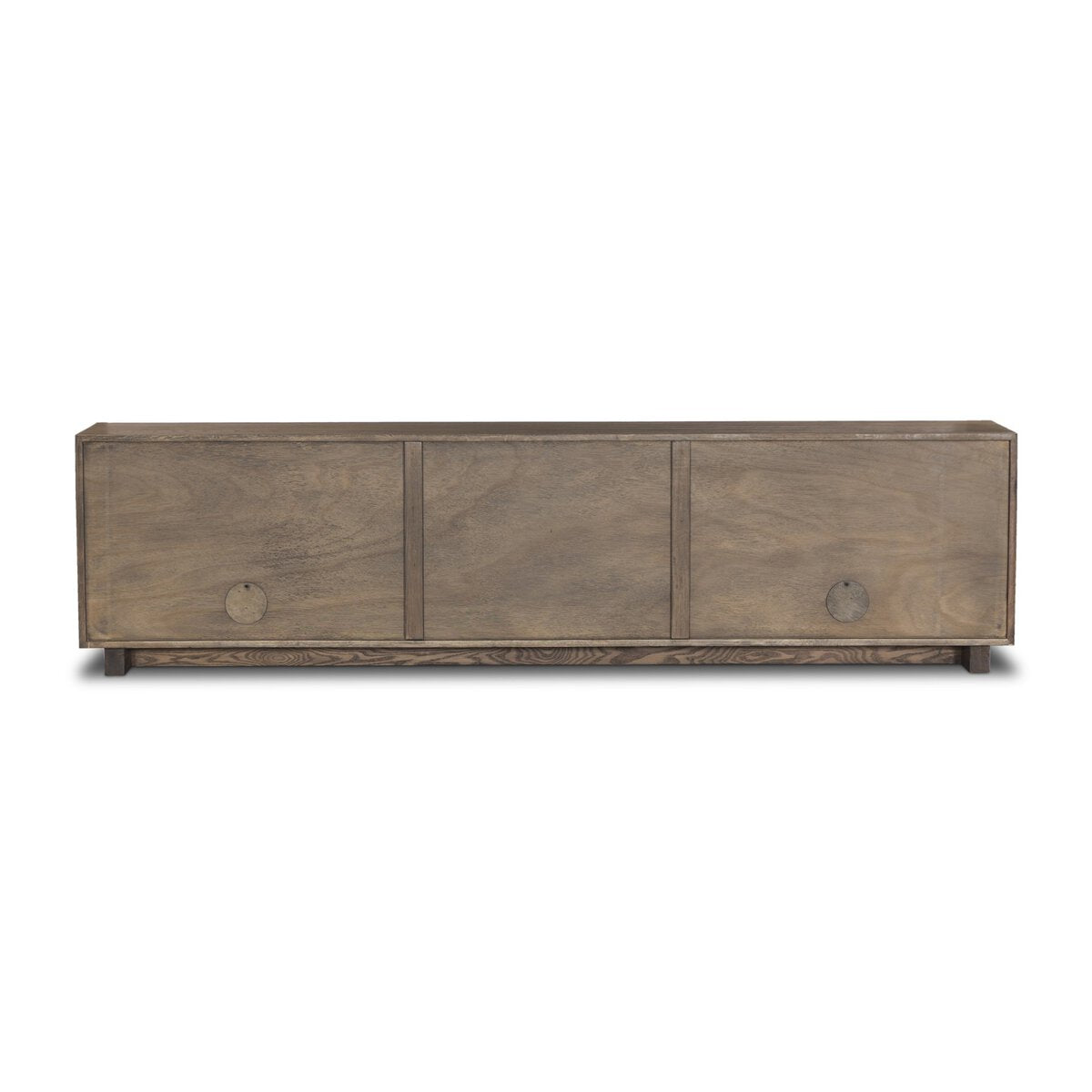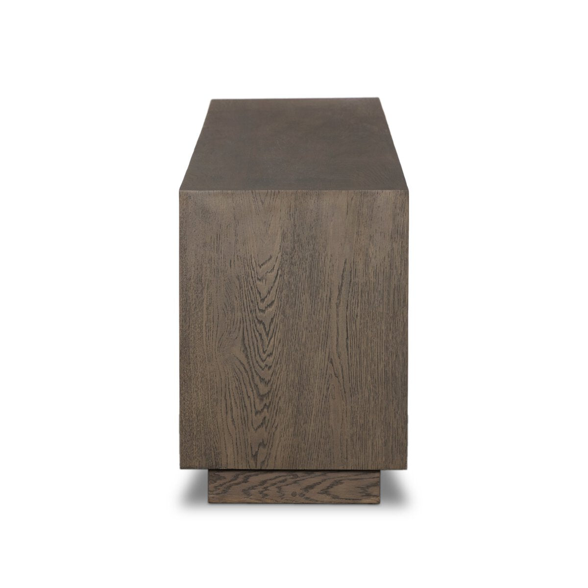 Grand-scale with a wide, low profile. Glass doors bookend central wood drawers, balancing display and concealed storage. Worn oak finish highlights clean lines, anchoring modern spaces with understated impact.