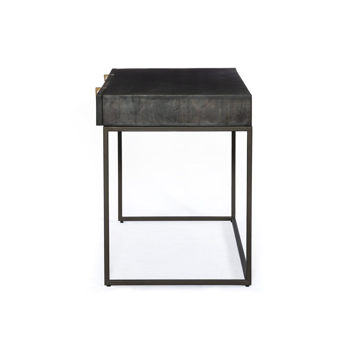 Unique linear carving meets fresh dimension with an artisan slant. Mango wood casing is finished in a vintage brown, highlighting texture and high craftsmanship. A slim iron base adds a long, airy look, while dual drawers keep desk necessities on hand.