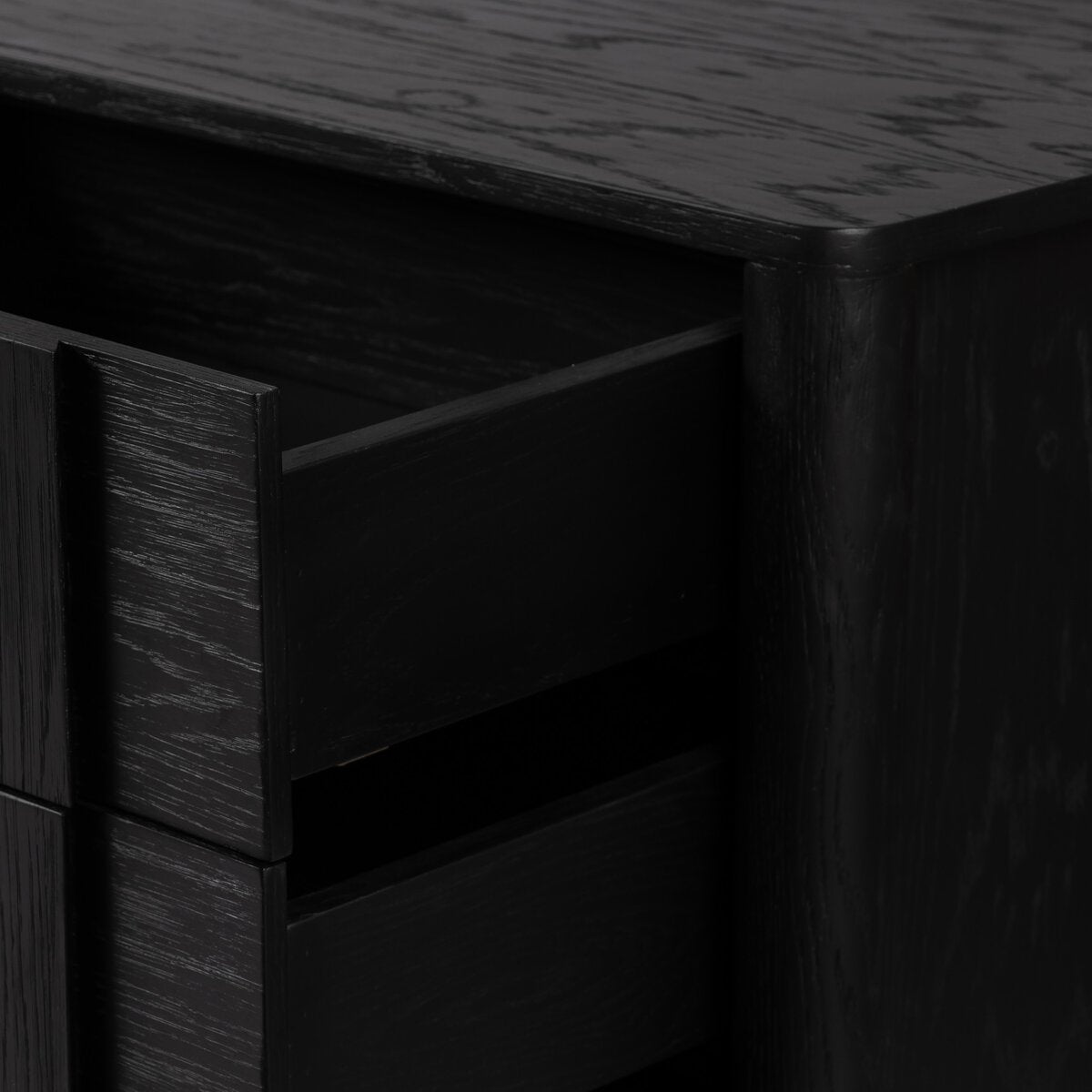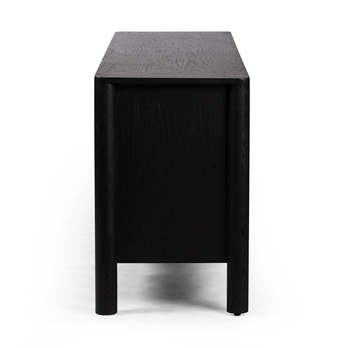 An ebony finish highlights the intriguing natural graining of oak veneer. Six spacious drawers plus center interior shelving bring maximum storage to the media or living room. Rear cutouts for cord management.