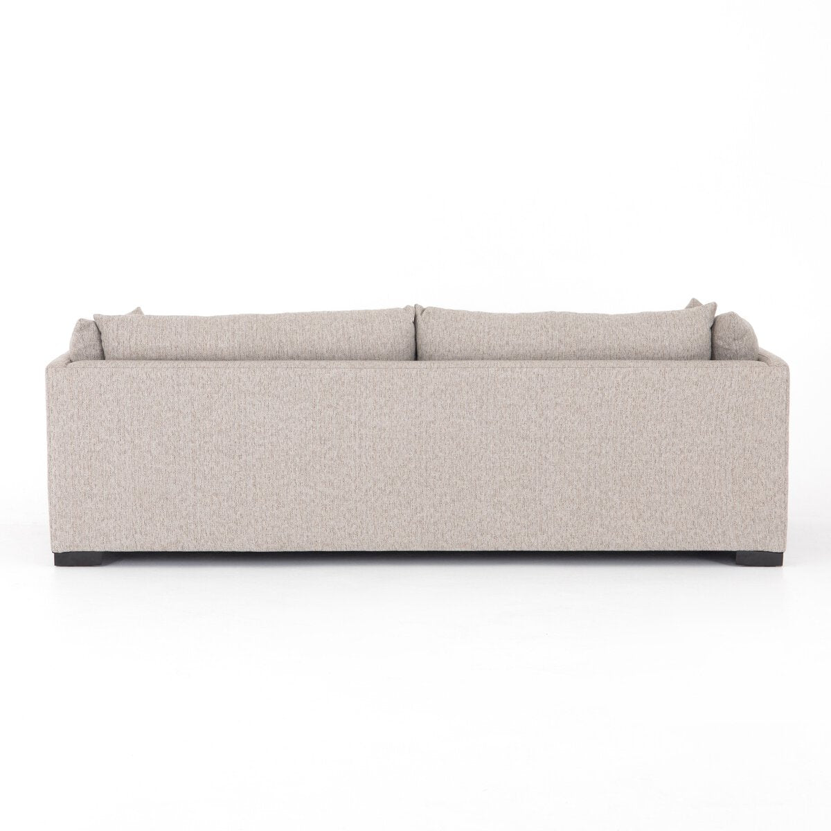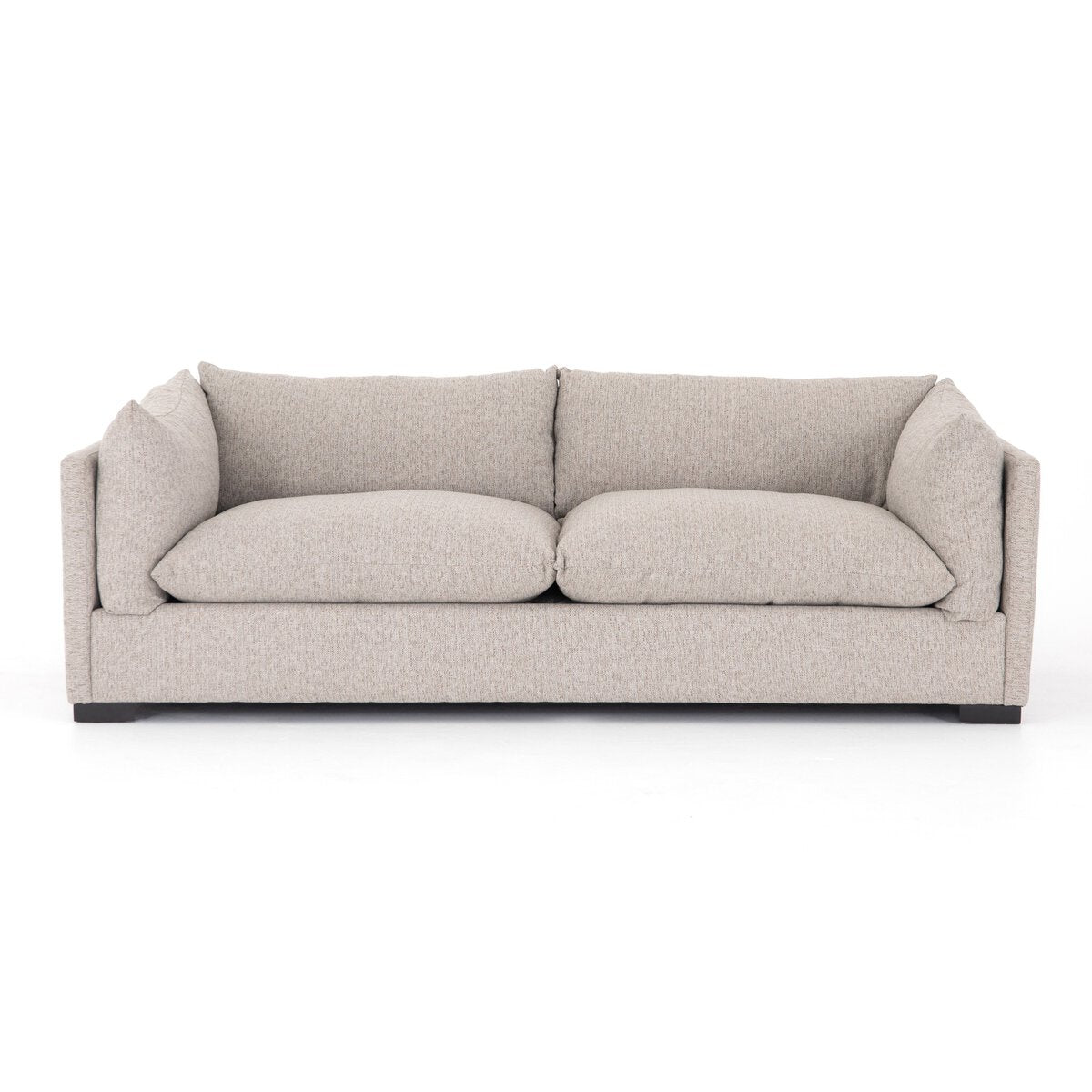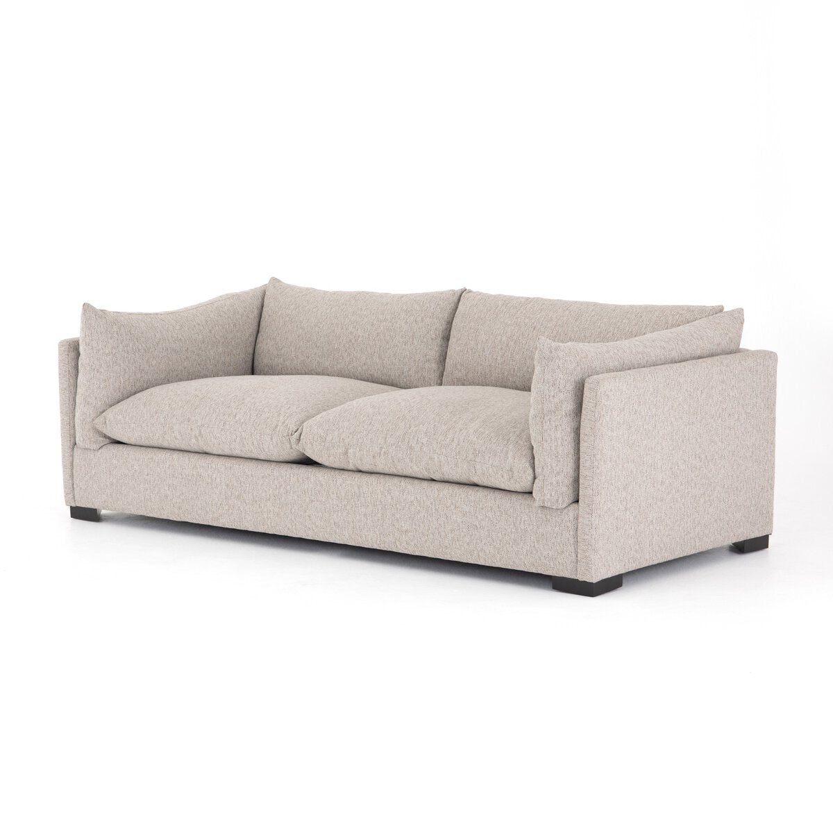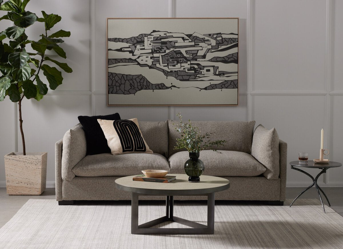 Everyday lounging, refreshed. Clean lines and charcoal upholstery meet a low, wooden base to keep things classy while casual.
