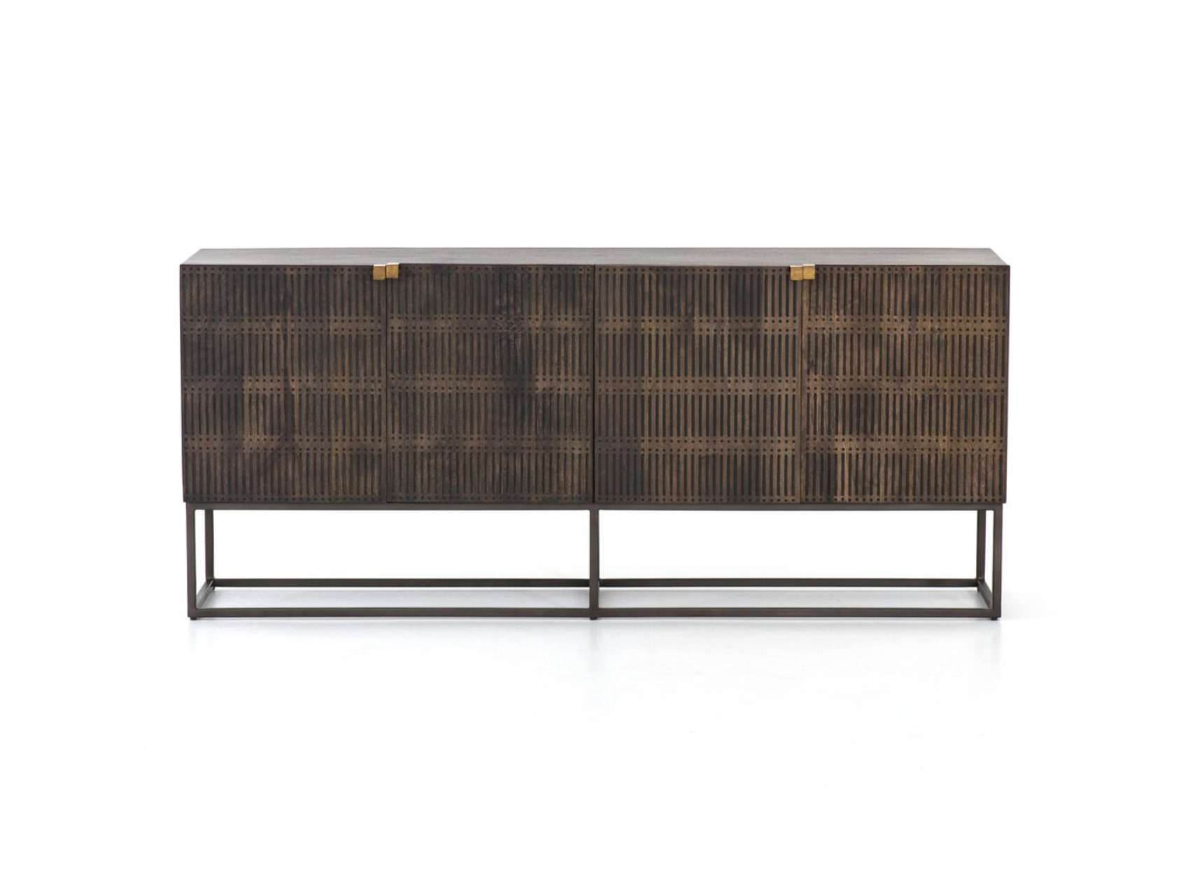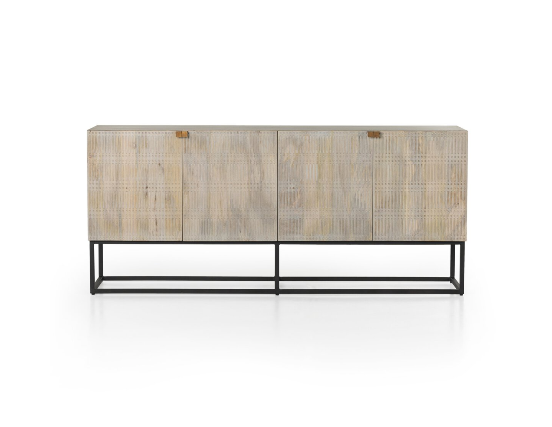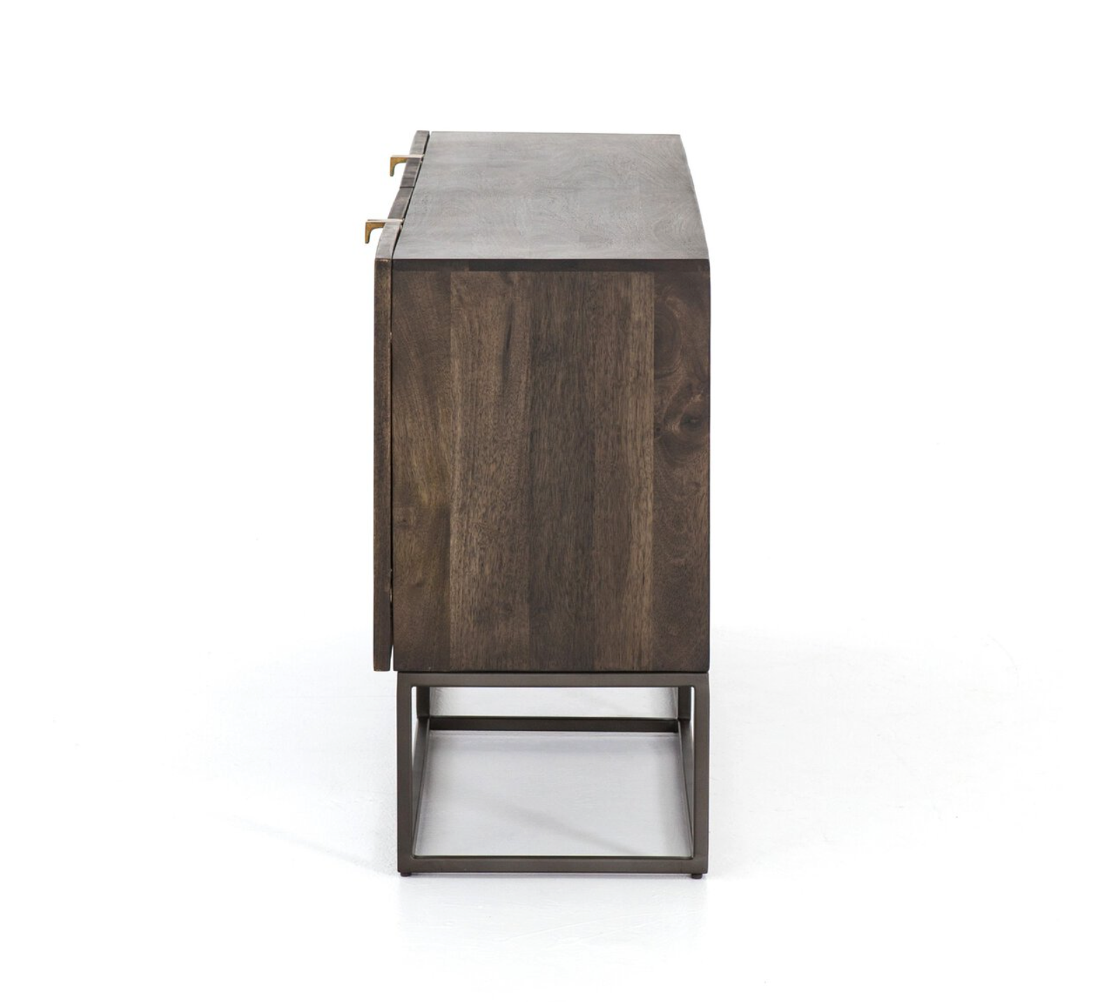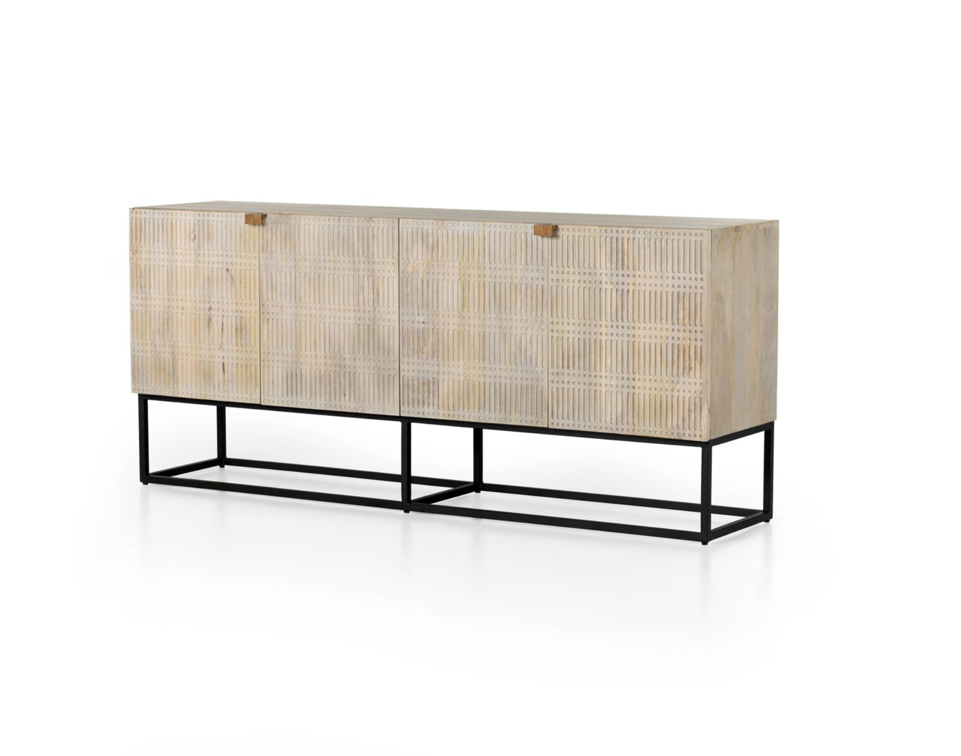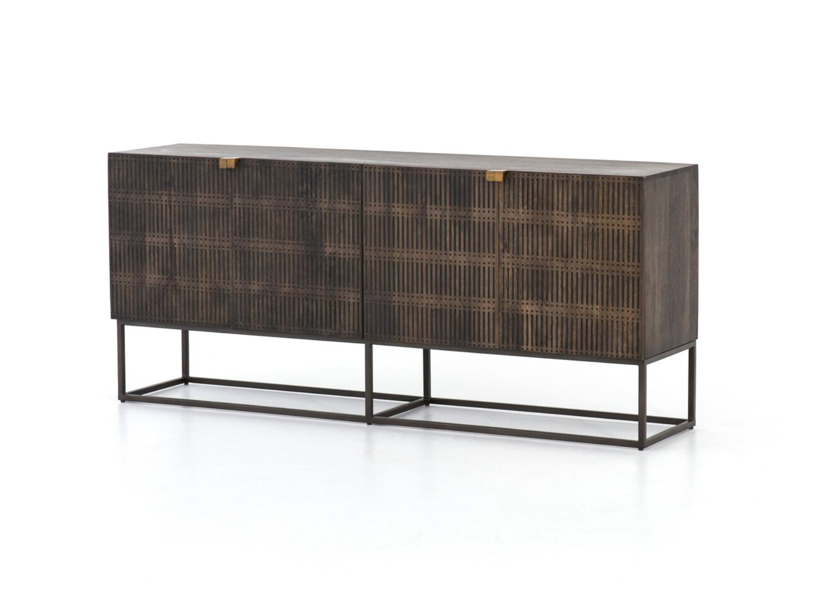 Mango wood's unique linear carving highlights texture and true artisanship. A slim iron base adds an airy, cage-like look to clean-lined storage.