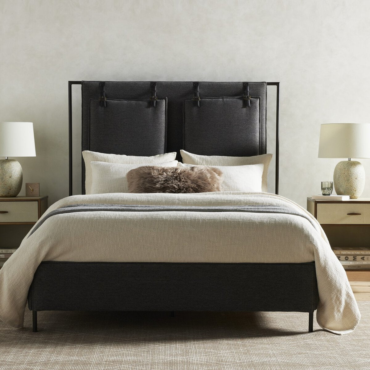 Safari styling gets a modern reboot. Linen-blend upholstery of ash grey lays a texture-rich base for a forward-thinking bedroom look. Black leather straps secure decorative headboard pillows, suspended for eye-catching effect. Box spring required.